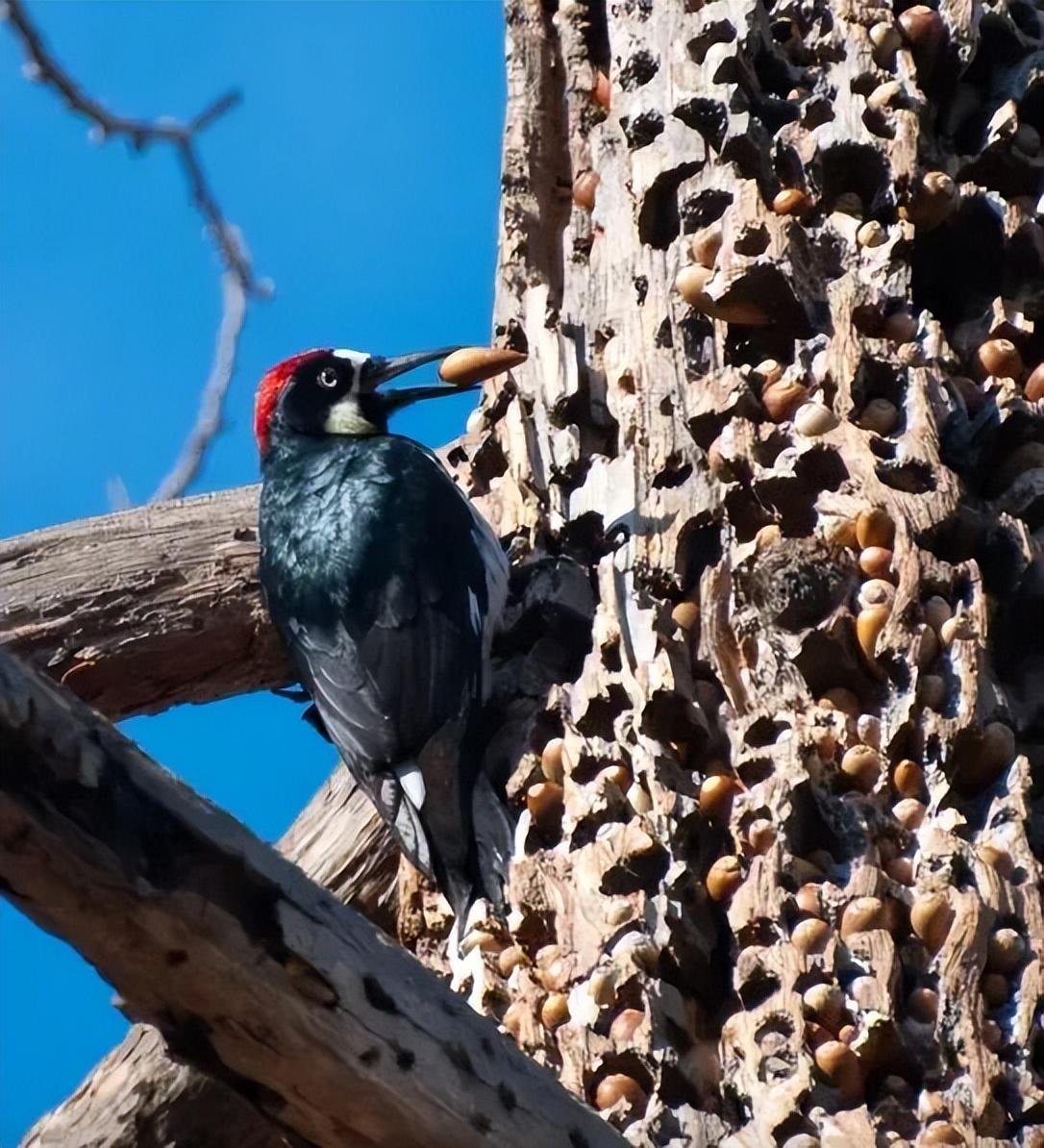 這一家遇到的,是啄木鳥家族裏的橡樹啄木鳥(Melanerpes formicivorus)。這種啄木鳥平時會以昆蟲、植物的果實爲食,但它們非常懂得“未雨綢繆”的道理,在秋天橡果成熟的時候,會到處收集橡果儲存起來。