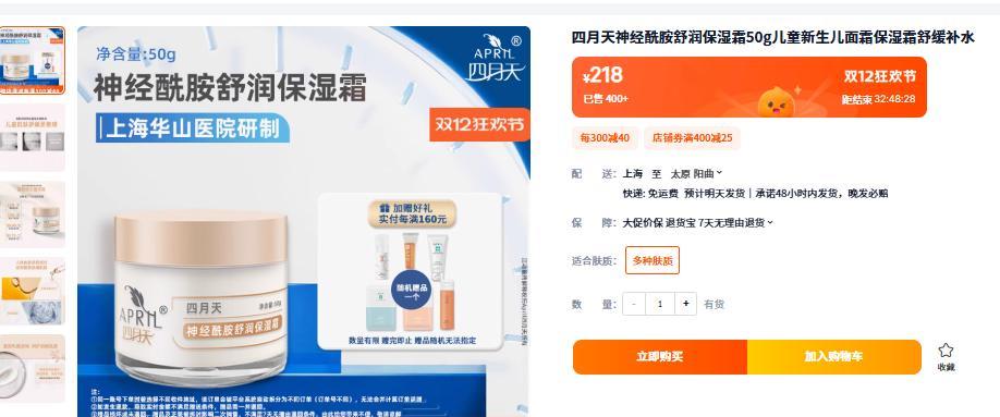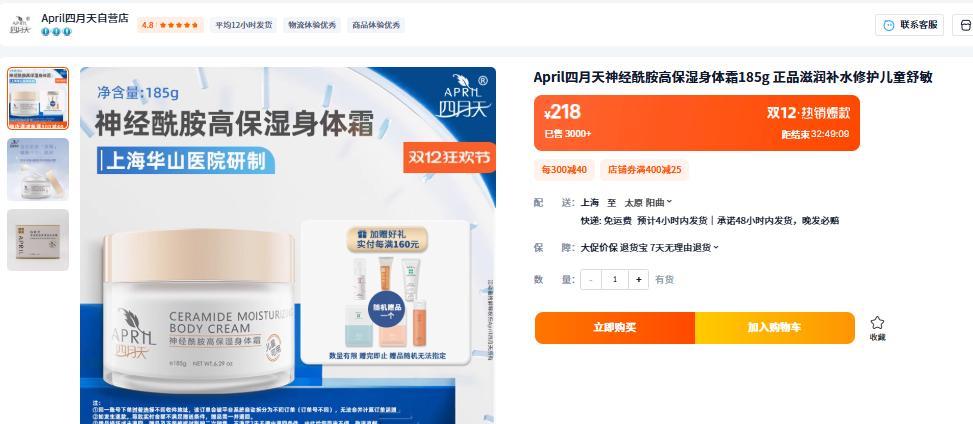 四月天神經酰胺滋養修護面霜某寶價格268元!
