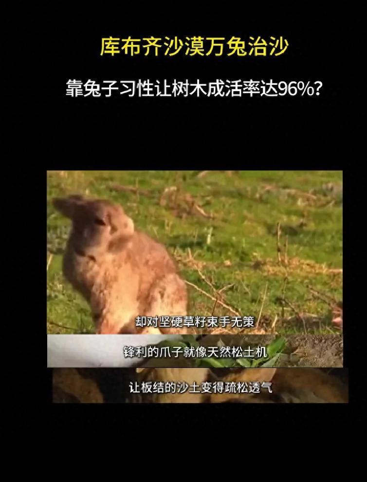 這個視頻的大概內容是,“爲了治理內蒙古庫布其沙漠,人們引進了上百萬只法國培育的獺兔。這些兔子和沙漠裏的沙柳成了 ‘黃金搭檔’——兔子啃食沙柳嫩枝,排出的糞便既能給沙柳當天然肥料,還能包裹住無法消化的草籽;雨季一到,這些裹在糞裏的種子就會生根發芽。更妙的是,兔子在沙漠裏翻找食物時,還能順帶疏鬆土壤。就這樣,靠着 ‘樹養兔、兔養地、地養樹’的循環,沙漠變成了綠洲。”