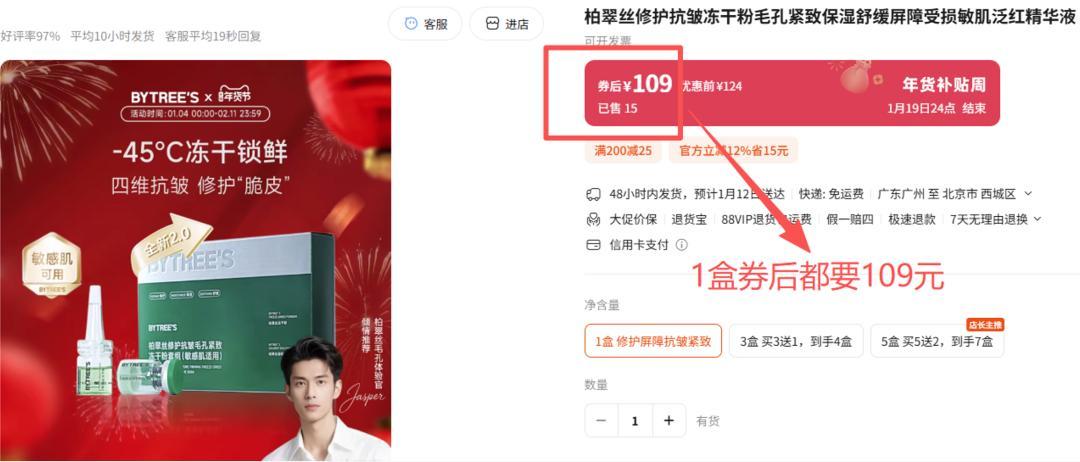 官方年貨節活動價是109元一盒,一盒包括兩對(凍乾粉+溶媒液),每天早晚使用,可用5-7天。