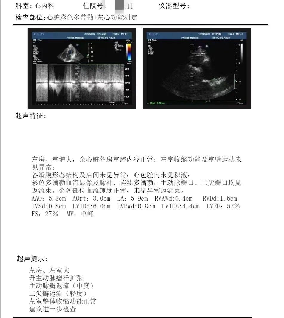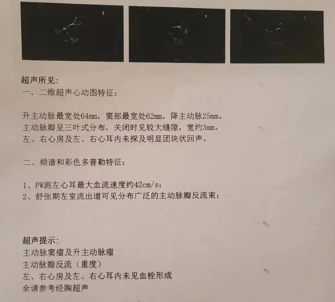 次日醫生讓做心臟超聲,報告顯示主動脈瓣中度返流,左房左室大,升主動脈瘤樣擴張。