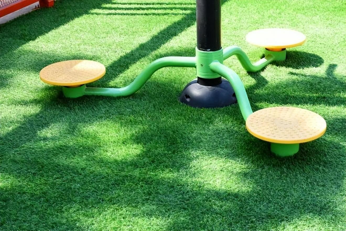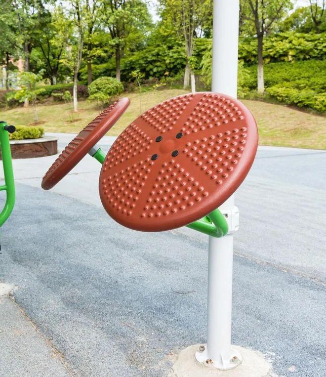 小區旋轉類健身器械的代表,它們通常是一個固定的中柱,上部提供手扶的支撐杆,下方爲一個可以旋轉的小圓盤。