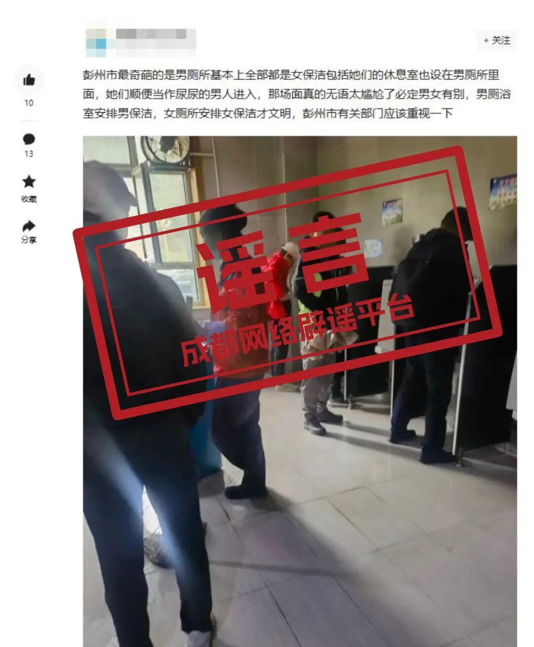 網傳彭州一男公廁都是女保潔、內設休息室?警方:不實信息,造謠者被行拘!