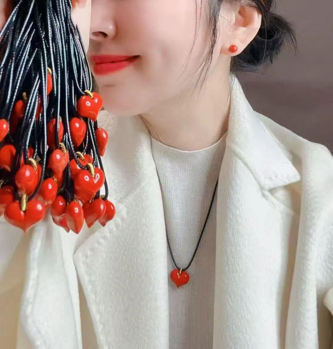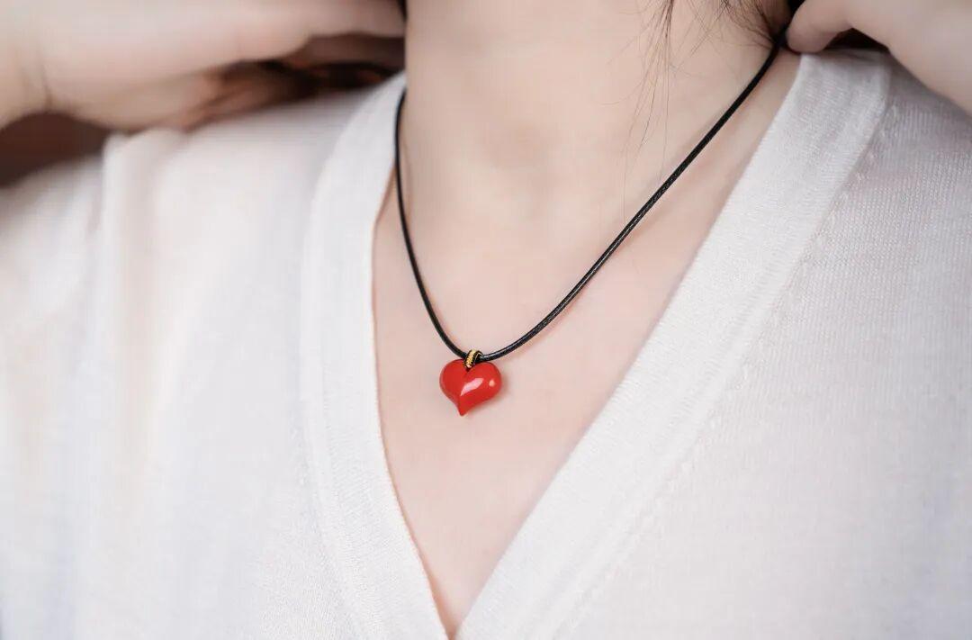 也可以搭配這條桃心硃砂項鍊,圓潤的心形非常減齡,搭配純色毛衣或大衣再合適不過。