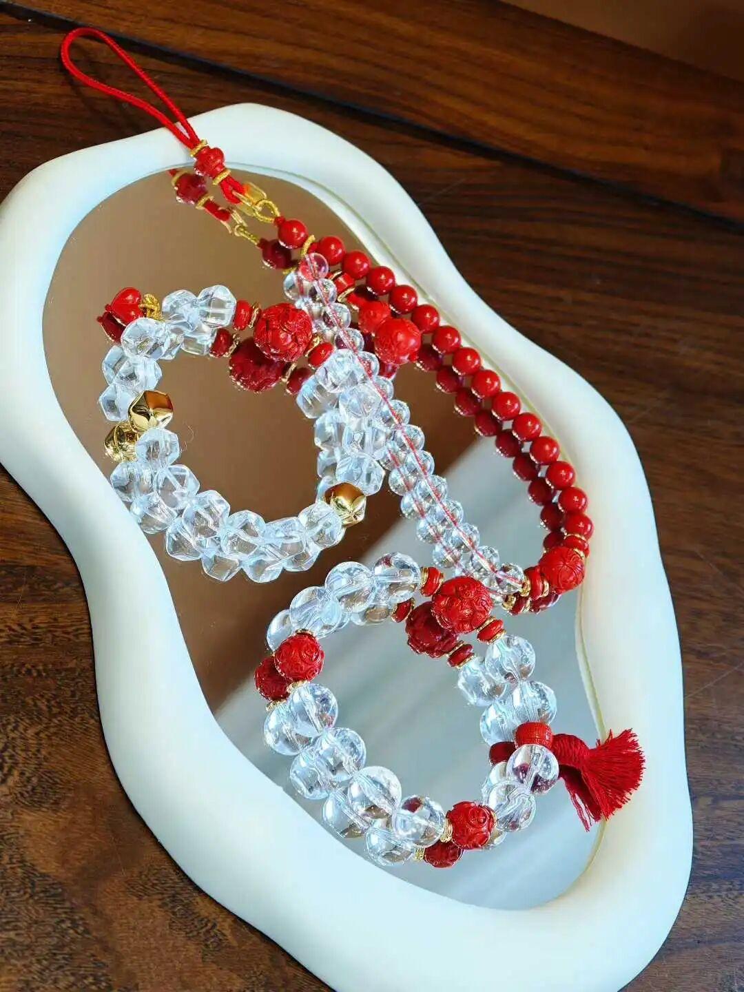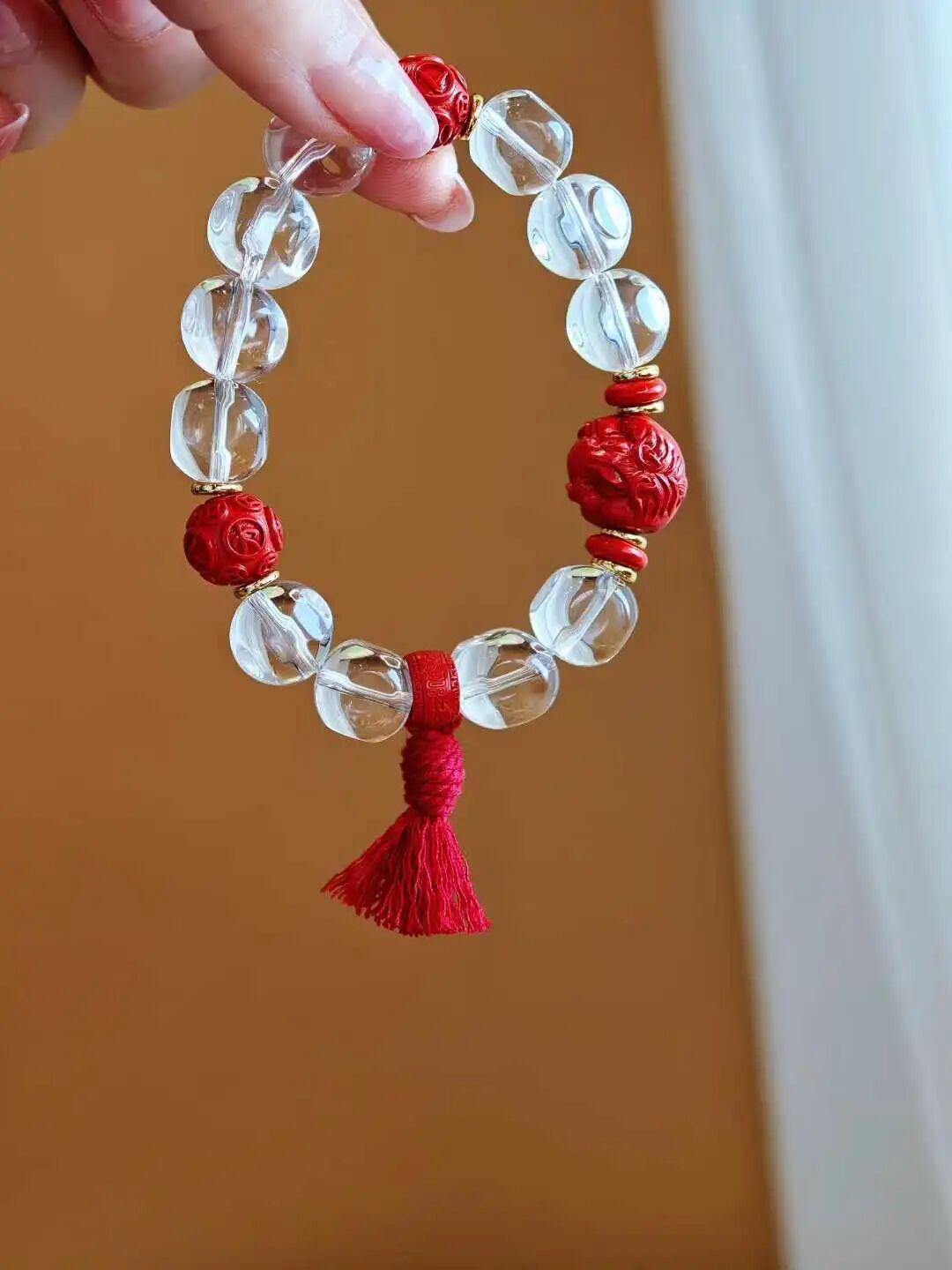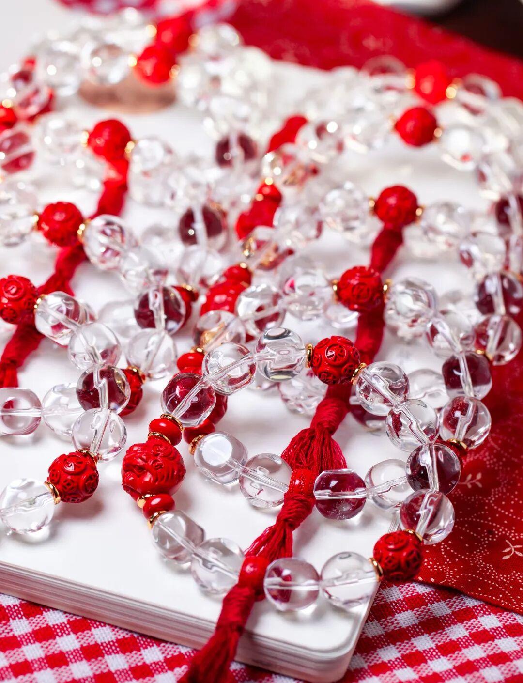 12mm的白水晶魔方珠清透亮澤,搭配兩顆雕刻“八方來財”紋樣的硃砂珠與一顆硃砂馬,再輔以靈動的紅繩流蘇,春節儀式感拉滿,卻不顯得用力過猛。