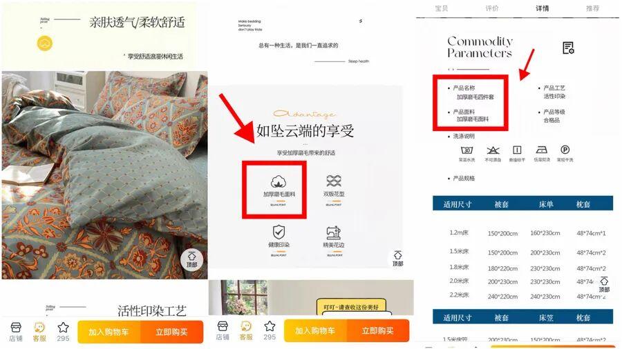 記者調查也發現,牀上用品“玩概念”的問題在電商平臺尤其突出。在線下市場,消費者不僅能觸摸到產品,還可以當場查看商品的詳情標籤或水洗標。對規範上市的產品來說,這些標籤上都必須具備規範的纖維名稱。但在電商平臺,絕大多數商家沒有在產品介紹頁面提供產品詳情標籤、水洗標的照片;而在介紹“面料詳情”時,要麼用商品推廣名稱代替規範的纖維名稱,要麼用“其他纖維”等字眼敷衍。也正因爲此,很多消費者被誤導。