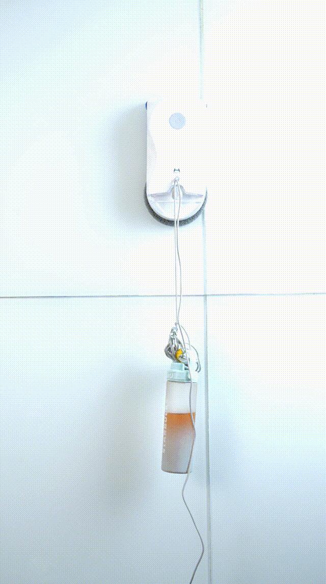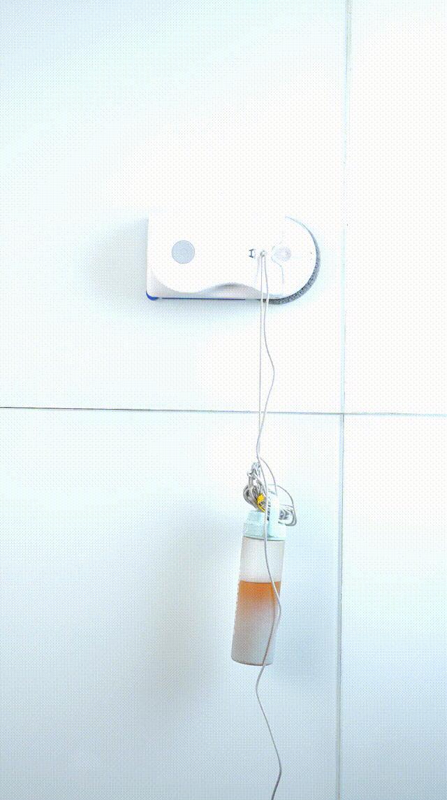 我們放了一瓶水做重物,擦窗機器人依舊能拉着水瓶穩穩爬升不掉!