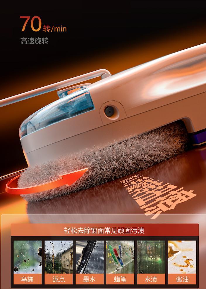 有赫特大家就能放心了!內置高轉速電機近26000轉/min,爲機器運行提供強大的吸附力,全程牢牢吸附,高層外窗放心使用。