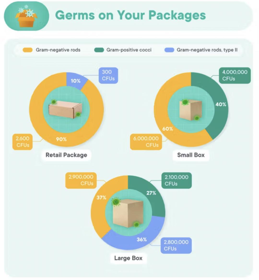 結果顯示,即使是送到收件人家門口的一個小型包裹上的細菌數量,也可能比一般的馬桶座圈上的細菌數量多出6倍。另一方面,大盒子裏的細菌數量可能是你家廚房水槽裏潛伏的細菌數量的11倍。