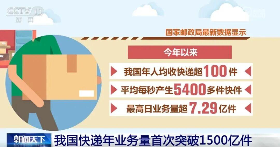 根據國家郵政局快遞大數據顯示,截至2023年11月17日,我國快遞年業務量首次突破1500億件。數據還顯示,2023年以來,我國年人均收快遞超100件,平均每秒產生5400多件快件,最高日業務量超7.29億件。