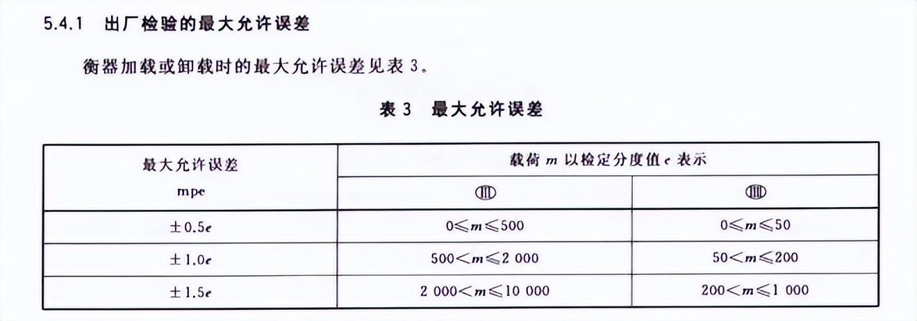 我們家裏常用的體重秤,屬於固定式電子衡器,按照《固定式電子衡器》(GB/T 7723-2017)中的規定,衡器的準確度等級分爲中準確度級(III)和普通準確度級(IIII),而電子衡器的最大允許誤差標準如下圖所示: