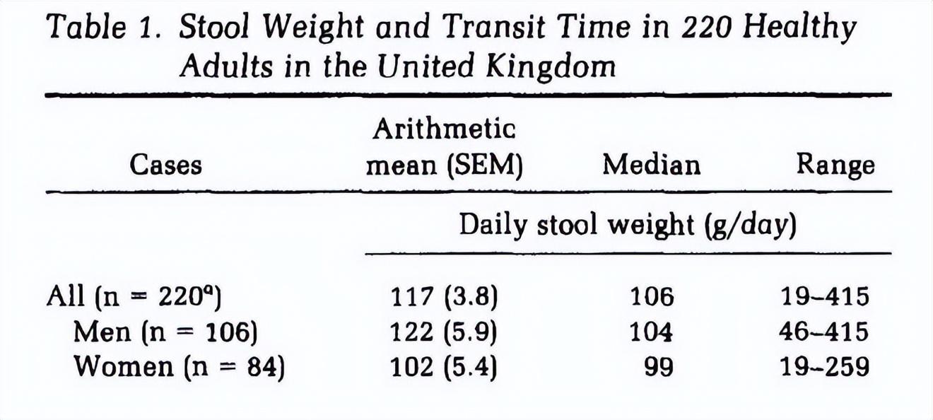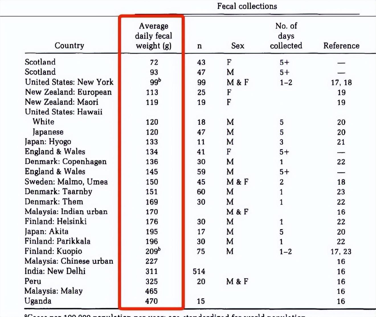 1992 年發表在《腸胃病學》(GASTROENTEROLOGY)上的一項研究就統計了世界很多個地區人羣的糞便與腸癌之間的關聯,其中的糞便平均重量恰好可以給我們做個參考。