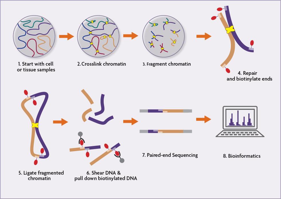 染色質環測序核心流程——固定、剪切、連接、測序讀取,本圖展示了Hi-C測序法。但無論什麼方法,核心流程是不變的|論文