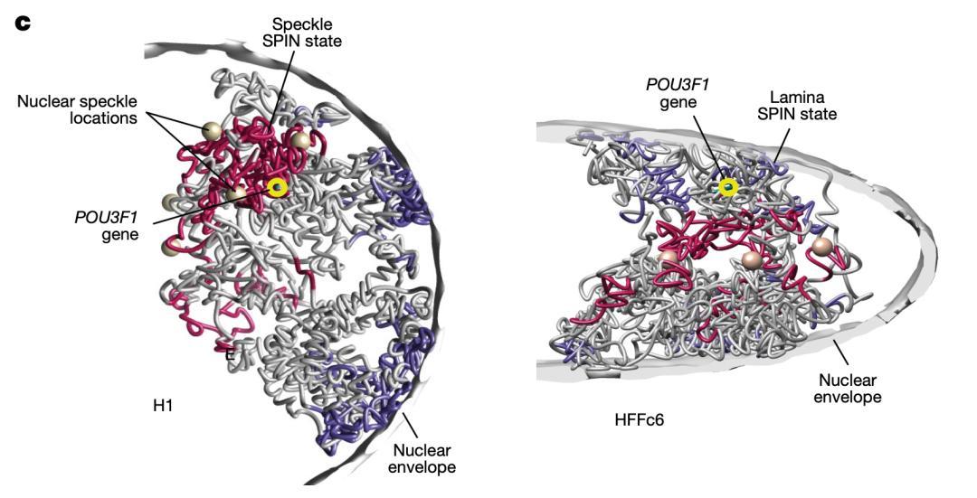 有了研究人員建立的圖譜,我們就能查到許多僅憑DNA序列本身看不出來的信息:例如哪些基因在三維空間裏會被摺疊到彼此附近,它們更傾向位於細胞核的哪些區域;以及當細胞狀態變化時——比如在DNA複製的不同階段——這些基因之間的相互作用關係又會如何隨之重排。