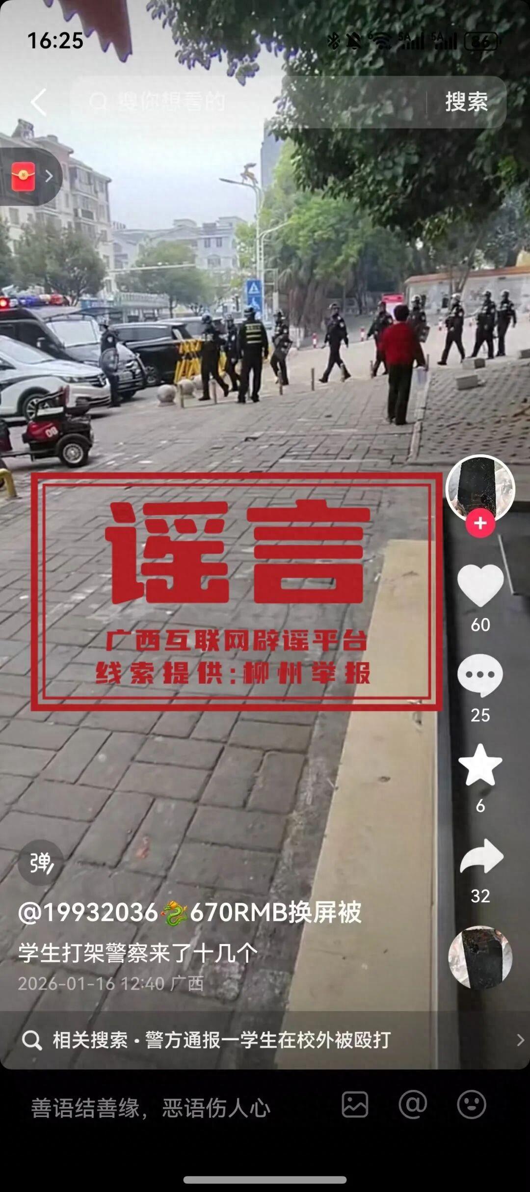 1月17日,柳州市鹿寨縣公安局城南派出所工作中發現該信息後,立即開展覈查工作。經覈實,鹿寨縣某小學近期並未發生學生打架事件,網傳信息純屬謠言。