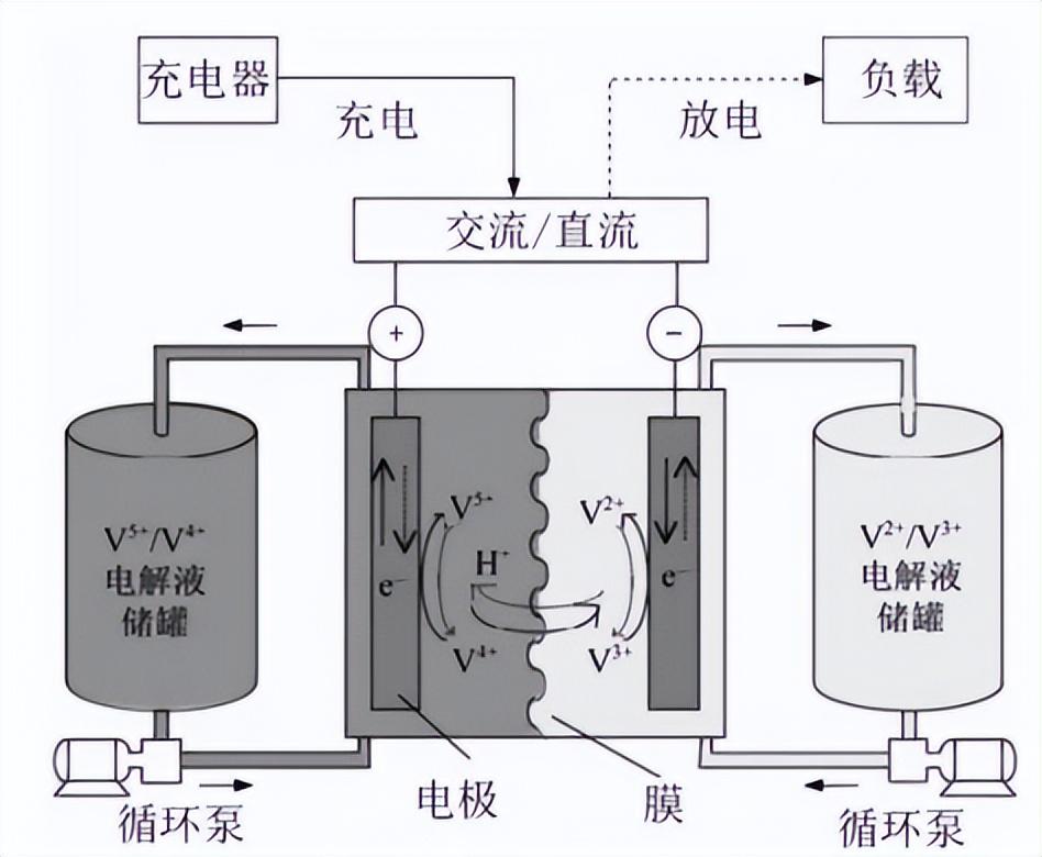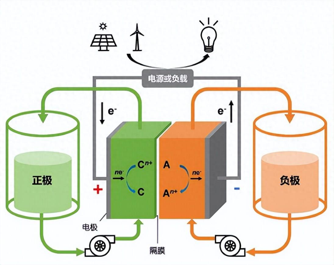 和傳統電池不同,這種電池的能量不是存儲在固態的電極材料中,而是儲存在電解質溶液中。液流電池的基本原理是通過電解質在電池內部的流動與電極反應實現能量的存儲與釋放。在充電過程中,電解質中的活性物質在電極上發生還原反應,吸收電子並儲存能量;在放電過程中,活性物質發生氧化反應,釋放電子並釋放能量。