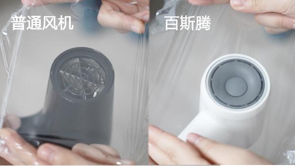 對比吹保鮮膜,普通吹風機很快燙出了洞,而百斯騰高速吹風機高溫大風速吹都完好無損。