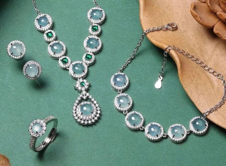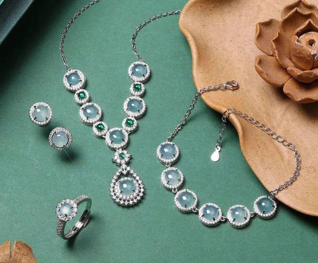 這套危料翡翠四件套裝是我們精心挑選給大家的: 項鍊、手鍊、耳釘、戒指。