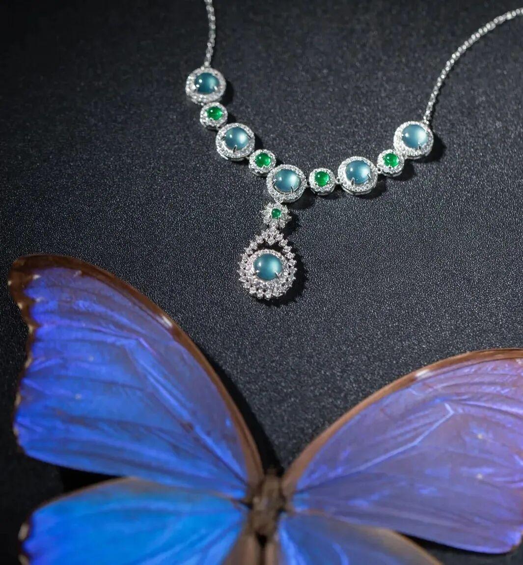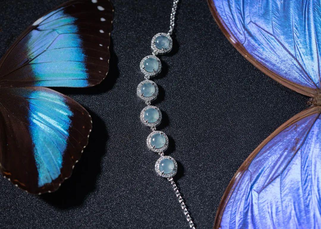 翡翠瑩瑩潤澤,隨光影流轉散發出 晨曦藍色的明媚與溫柔。