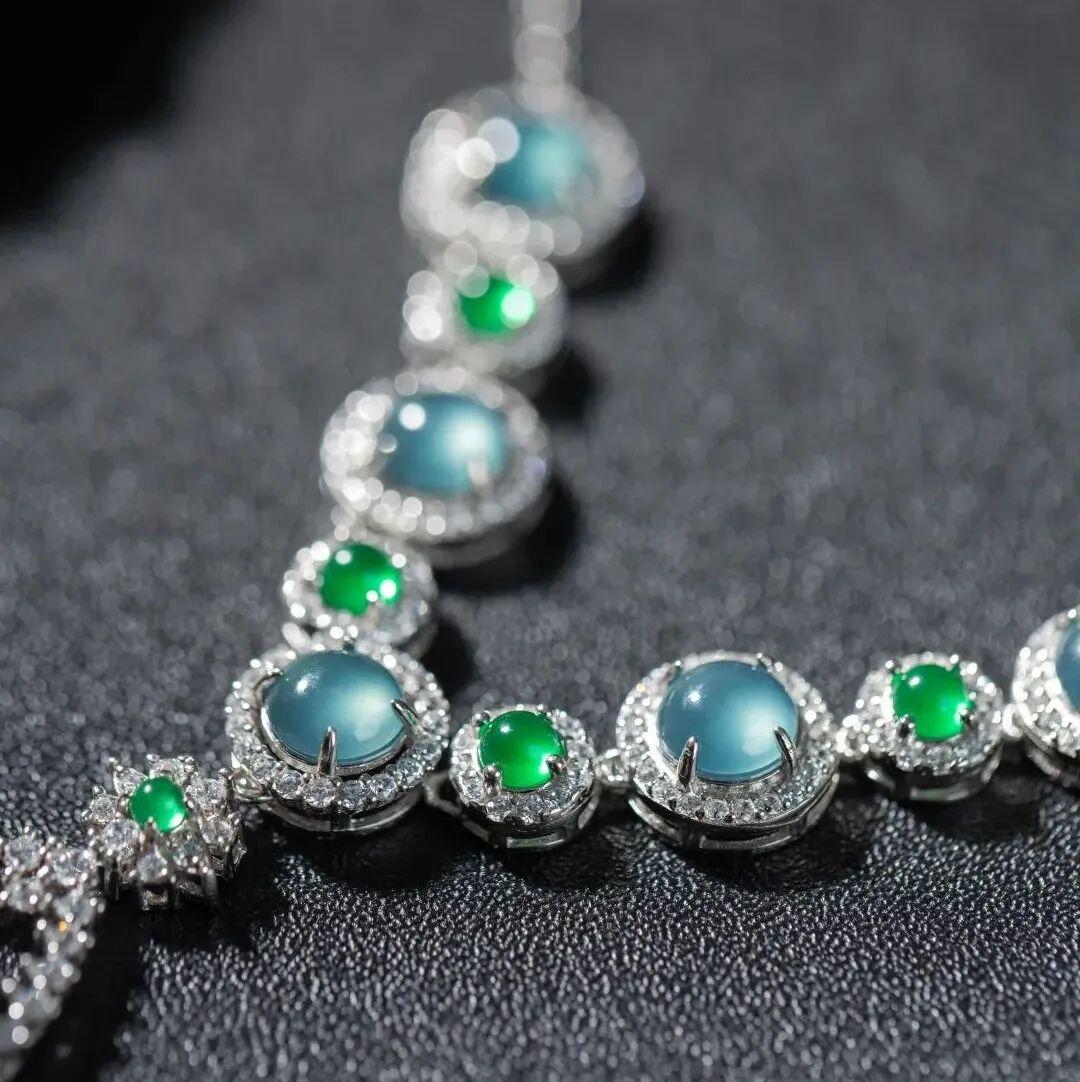細看,蛋面成色相近,光下的 種水和光澤感看着十分均勻統一。不僅如此,項鍊還挑選了綠色的危料翡翠一同鑲嵌,陽綠與藍水的碰撞更將翡翠的冰透美感提升到一個新的高度,