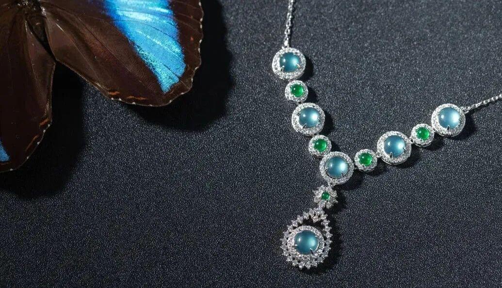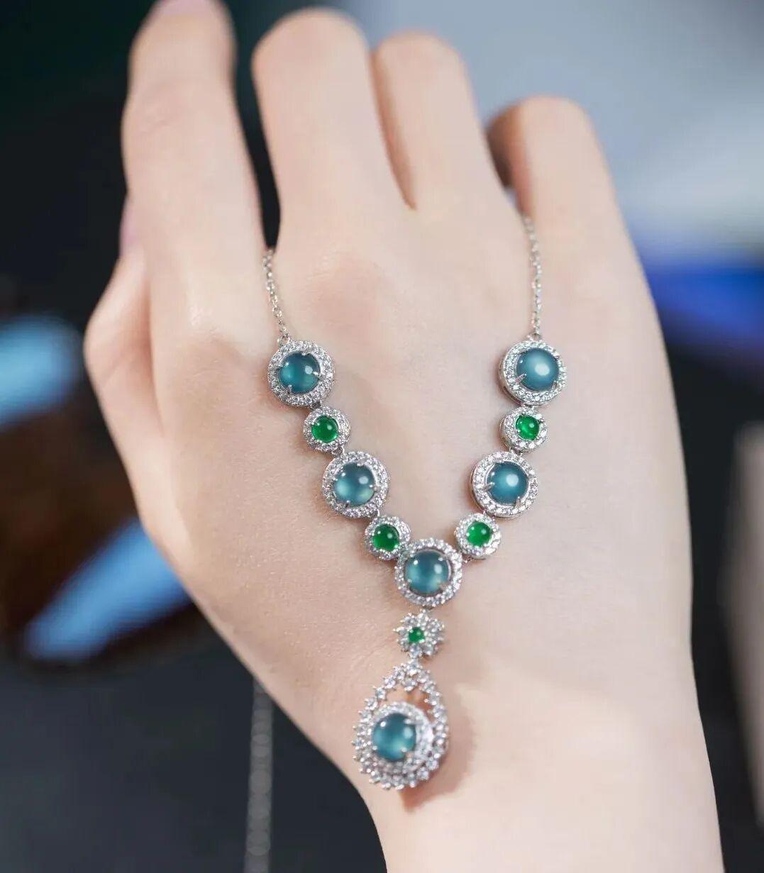 這款翡翠項鍊通過巧妙複雜地鑲嵌後, 銀色光澤與冬日冰雪般的藍色翡翠交相呼應,更顯翡翠迷人勾魂的魅力。