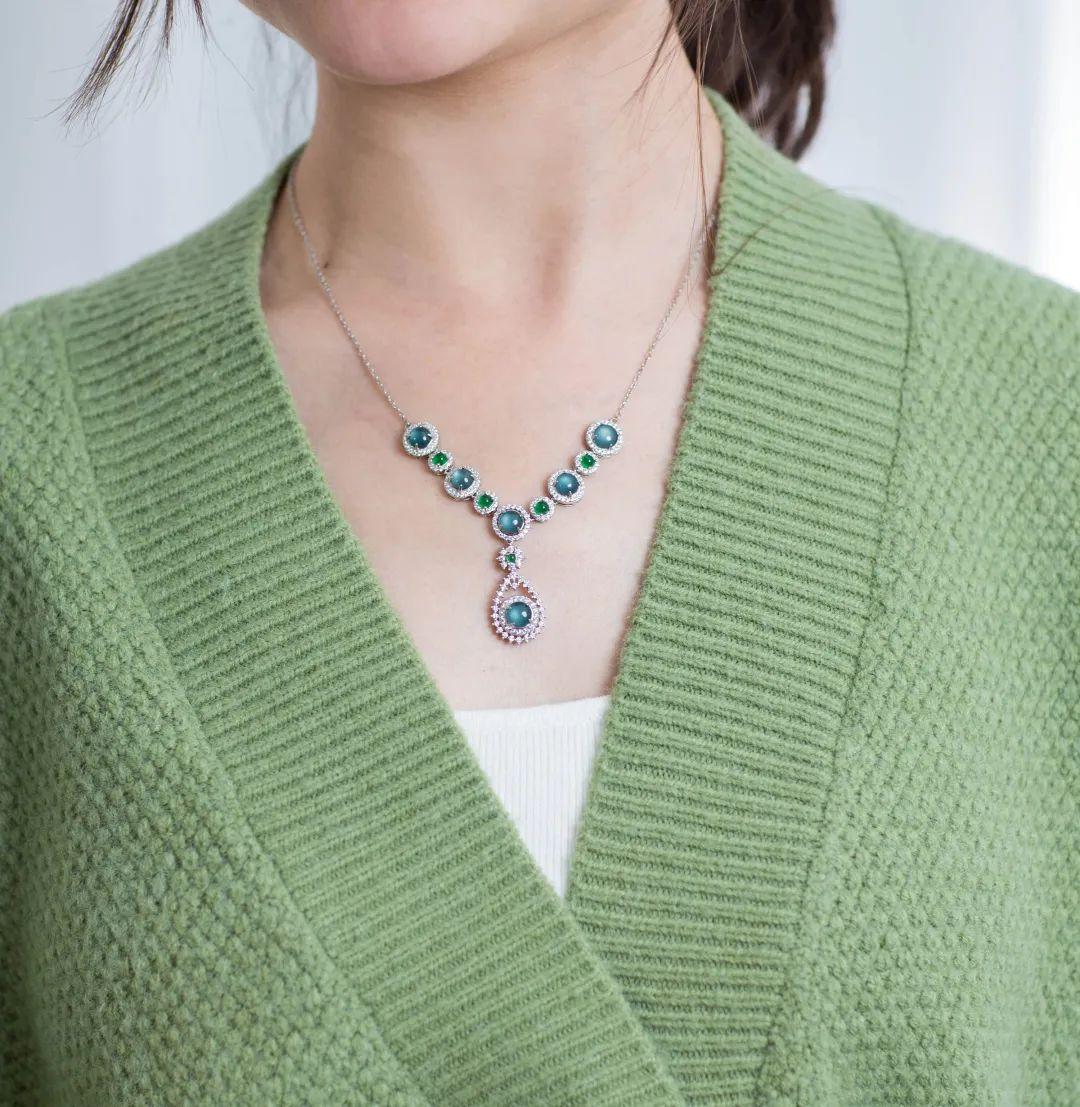 顆顆翡翠蛋面飽滿,在光下的實拍,冰透感和膠感都掩蓋不住呼之欲出,佩戴在頸肩起到畫龍點睛的效果。
