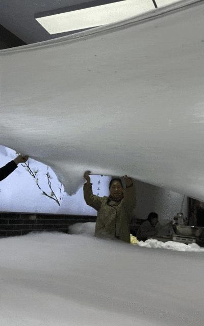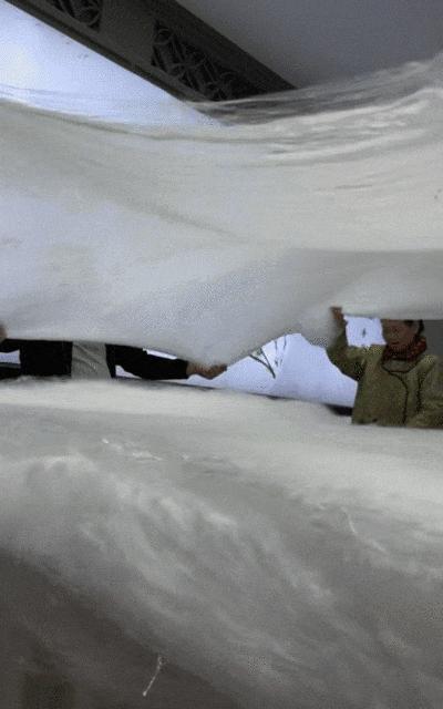 絲胎拉制後,厚薄均勻。一針一線,都是老師傅手工操作,只爲做出一牀的合格蠶絲被!
