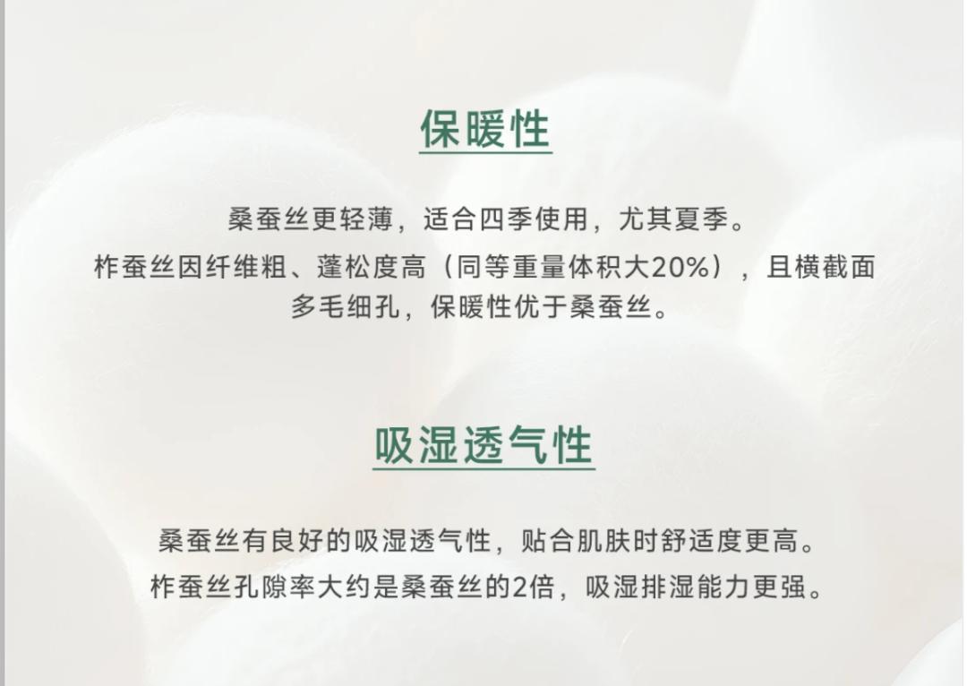 這種蠶絲產自北方寒帶,氣候寒冷,蠶絲纖維長得更粗壯!內部組織多孔隙,保暖性和彈性都遠超普通桑蠶絲!