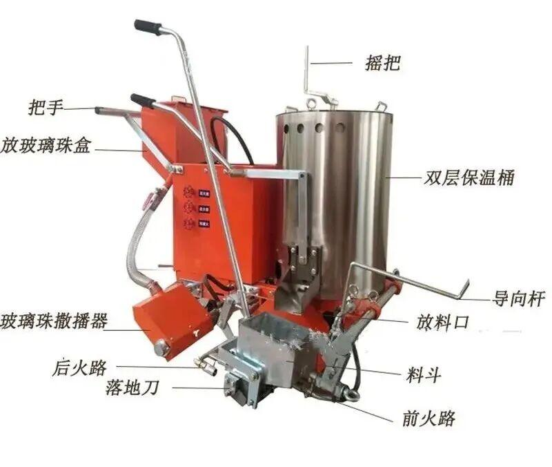 估計有小可愛會問,那上面那種漏斗,沒個保溫功能,塗料用着用着就硬化了,怎麼辦?別急,馬上推出更高級的——手推式熱熔劃線車!一個體型更大的車子,不僅擁有保溫桶,還有點火裝置,實時給塗料加熱!即用即走,有理由相信張小龍做微信也是被它啓發......
