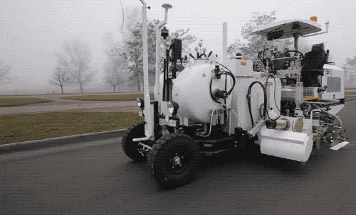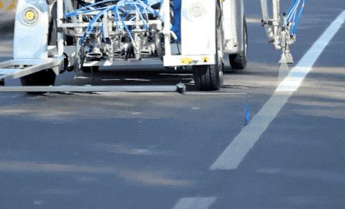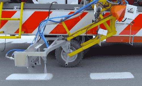 到了大馬路上,上面的那些小機械,就不怎麼夠看了,必須得請出我們更高級的大傢伙——噴漆車!這個是很常見的小貨車改裝版工程車,只要在車的側邊增設一個噴漆設備,把噴頭探出車的邊沿,就可以開始自動噴漆了~