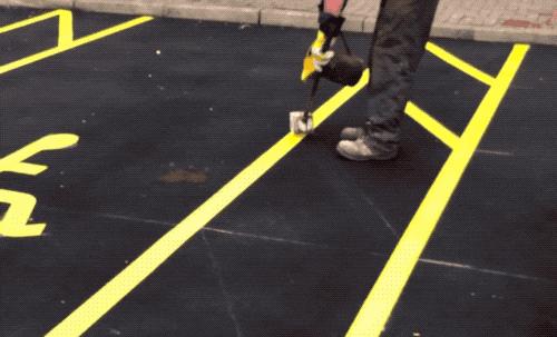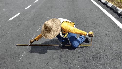 接着就沿線走動,手則穩如泰山,油漆就順利地在路面上變成了圖案清晰的路標。