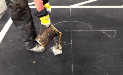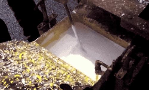 這裏注意看,還會發現油漆咋還冒煙呢?因爲使用的塗料是熱熔性的,需要在一個大釜里加熱成熔融態後,才能用來給路面畫線。這也是我國用的最多的一種路面塗漆~