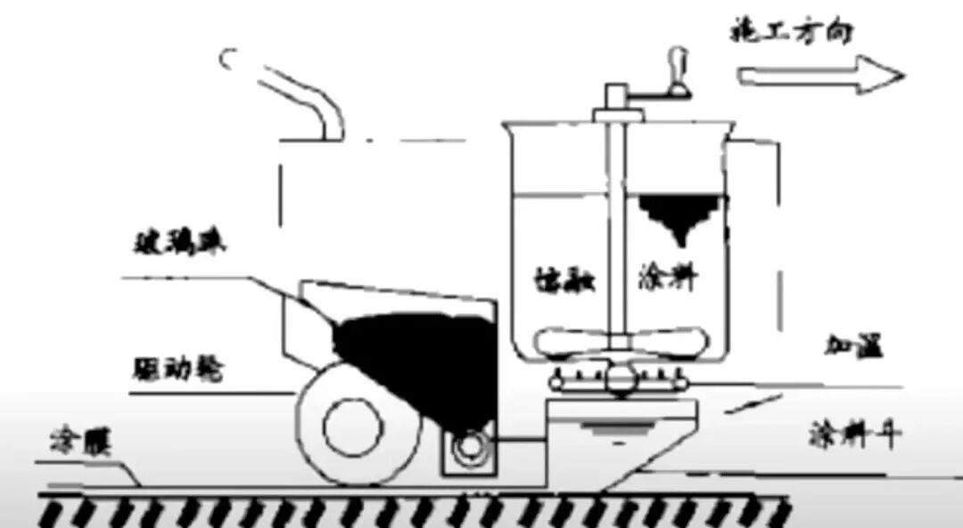 來看個簡化的原理圖,右邊的大桶裏裝着塗料,加熱就讓他們處於熔融狀態。然後順着料斗落在地面上,就形成了一層塗膜。至於這個左邊的玻璃珠有啥用呢?