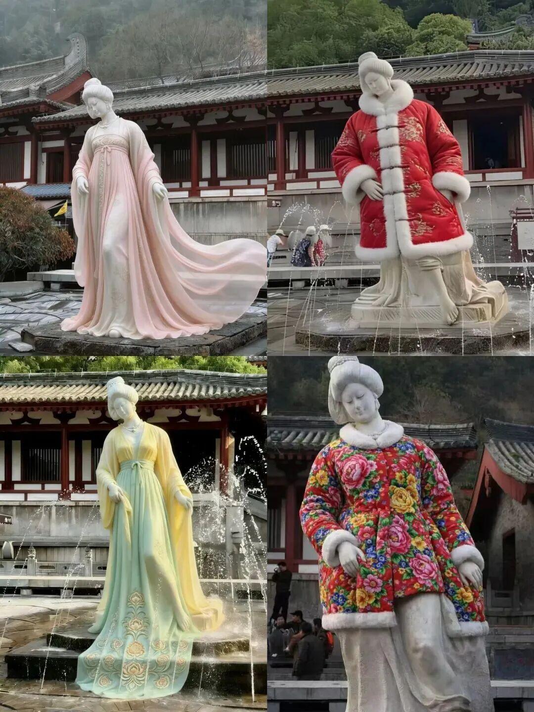 許多熱心人士擔心石頭凍着,幫雕像p上了大花棉襖。AI不懂什麼傳統服飾的朝代、形制,只會根據指令胡亂瞎穿。