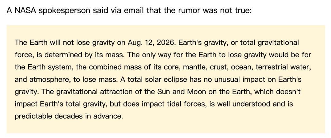 面對謠言擴散,NASA 通過國際權威事實覈查網站 Snopes 明確表態:“地球絕不會在 2026 年 8 月 12 日失去引力,這一說法毫無科學依據”。