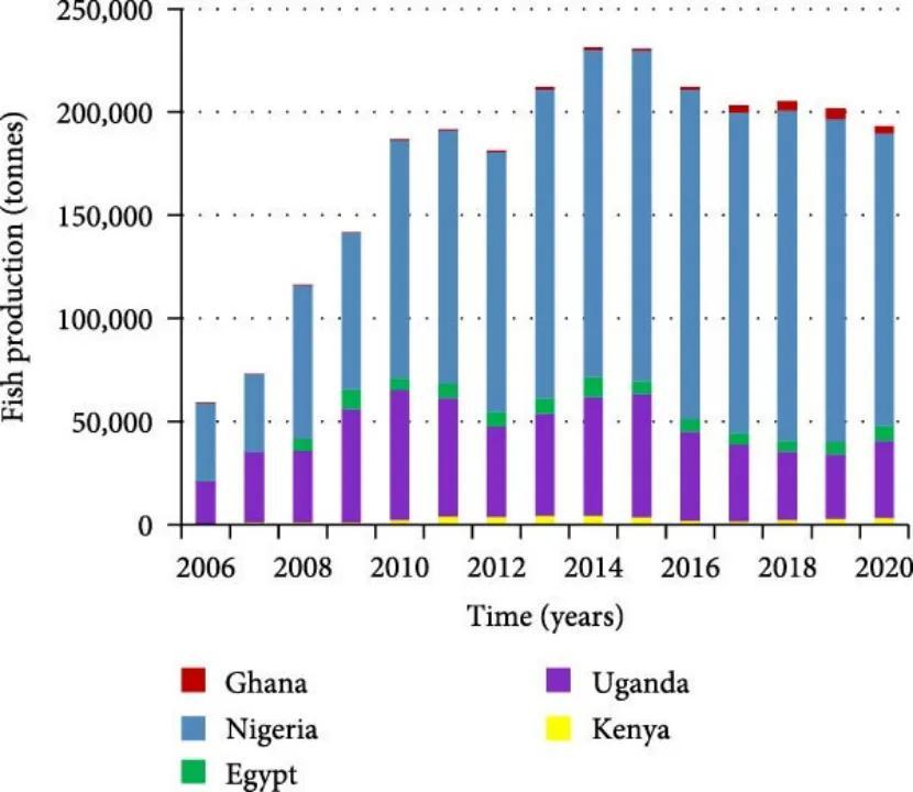 2006-2020年間,非洲五個主要養殖國(尼日利亞、烏干達、加納、埃及和肯尼亞)的尖齒胡鯰年產量。 總產量在2014-2015年左右達到峯值(約23萬噸),此後呈下降趨勢丨參考文獻[2]