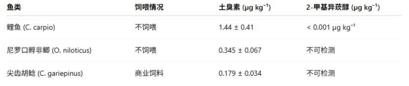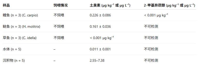 對於兩個魚塘裏飼養魚類、水體、底泥沉積物的土臭素和2-甲基異莰醇含量的檢測結果。鯉魚底棲又喜歡翻底泥,魚肉中的土臭素含量最高,也因此喫起來腥味最重丨參考文獻[17]