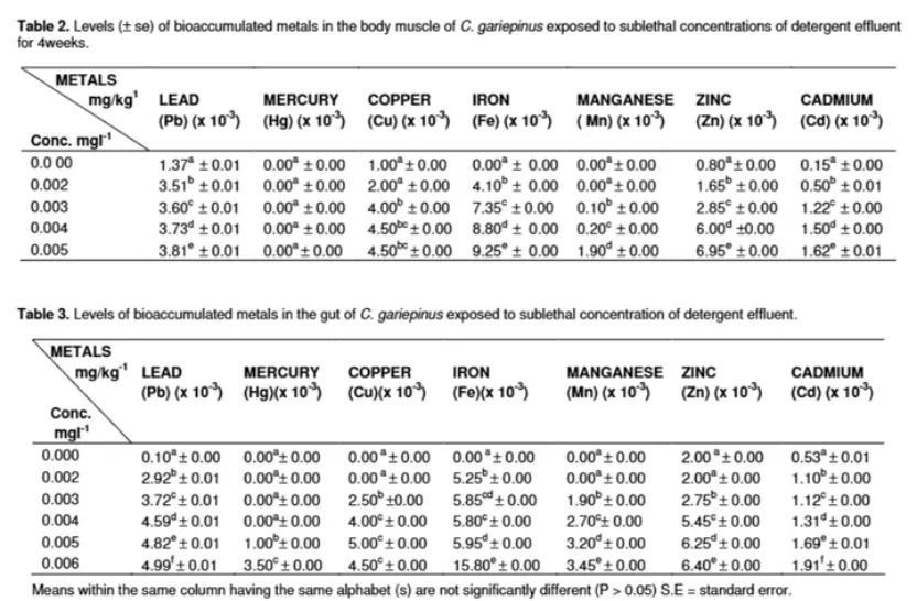 2009年的另一項研究中,尖齒胡鯰對於水體中的鉛(Pb)、汞(Hg)、銅(Cu)、鐵(Fe)、錳(Mn)、鋅(Zn)、鎘(Cd)這些重金屬都表現出了明顯的生物放大作用,這些重金屬會在尖齒胡鯰的肉、腸道和鰓等部位裏富集,並且水體裏的重金屬濃度越高,尖齒胡鯰體內的重金屬富集越明顯。丨參考文獻[5]