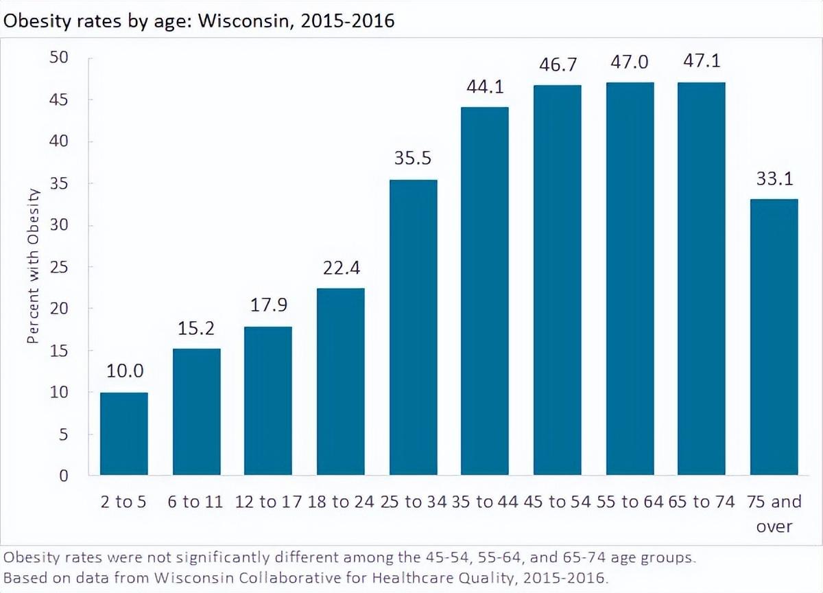 美國一項調查顯示,未成年時期,人們總體的肥胖率都是比較低的。但成年人後,肥胖率就開始增加。數據顯示,18~24 歲的時候,肥胖率是最低的,只有 22.4%,但25 歲就是一個分水嶺,從 25 歲以後,肥胖率就開始飆升,而 45~74 歲階段是肥胖率最高的。
