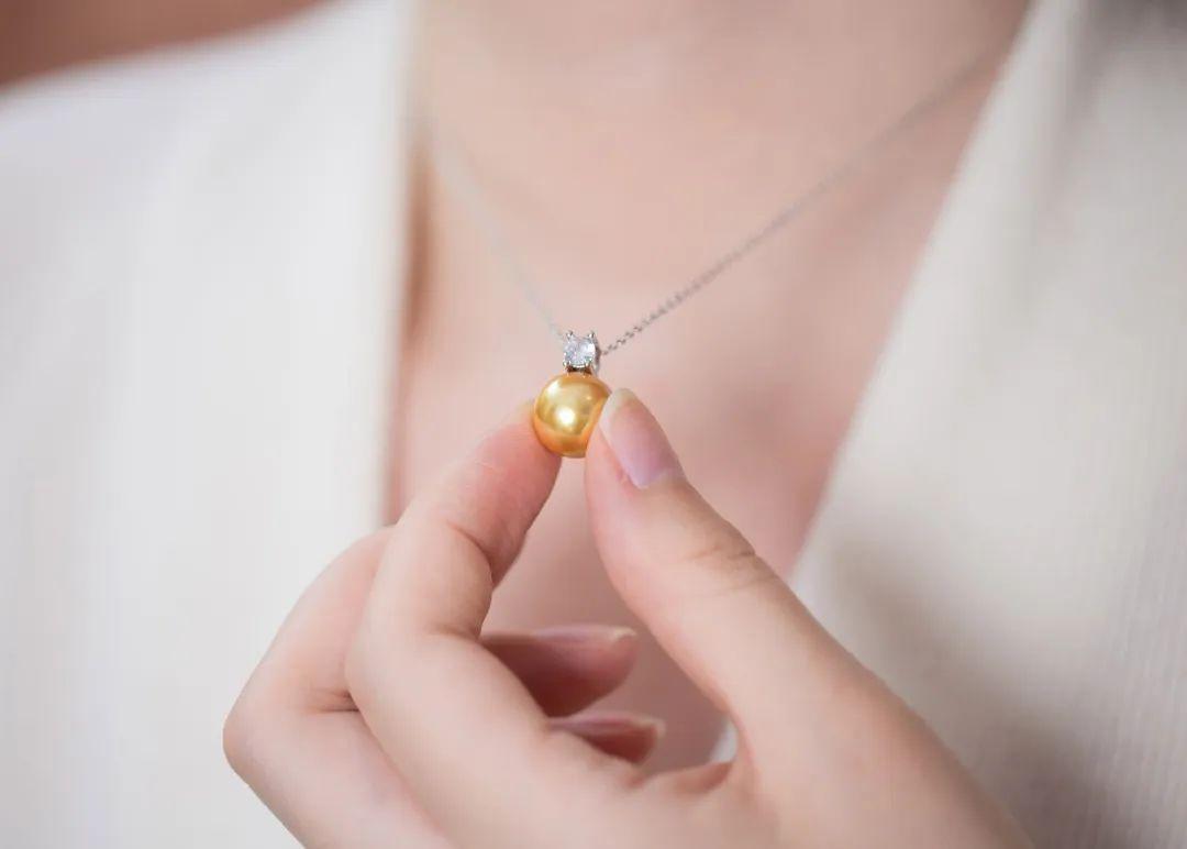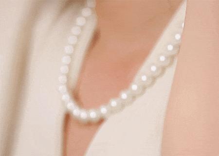 順延光線的盡頭,在吊墜的上游走, 溫柔的光暈縈繞整顆珍珠,珠光在頸間綻放,好生撩人。