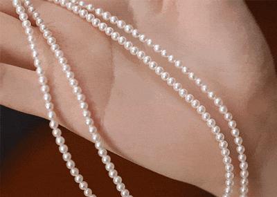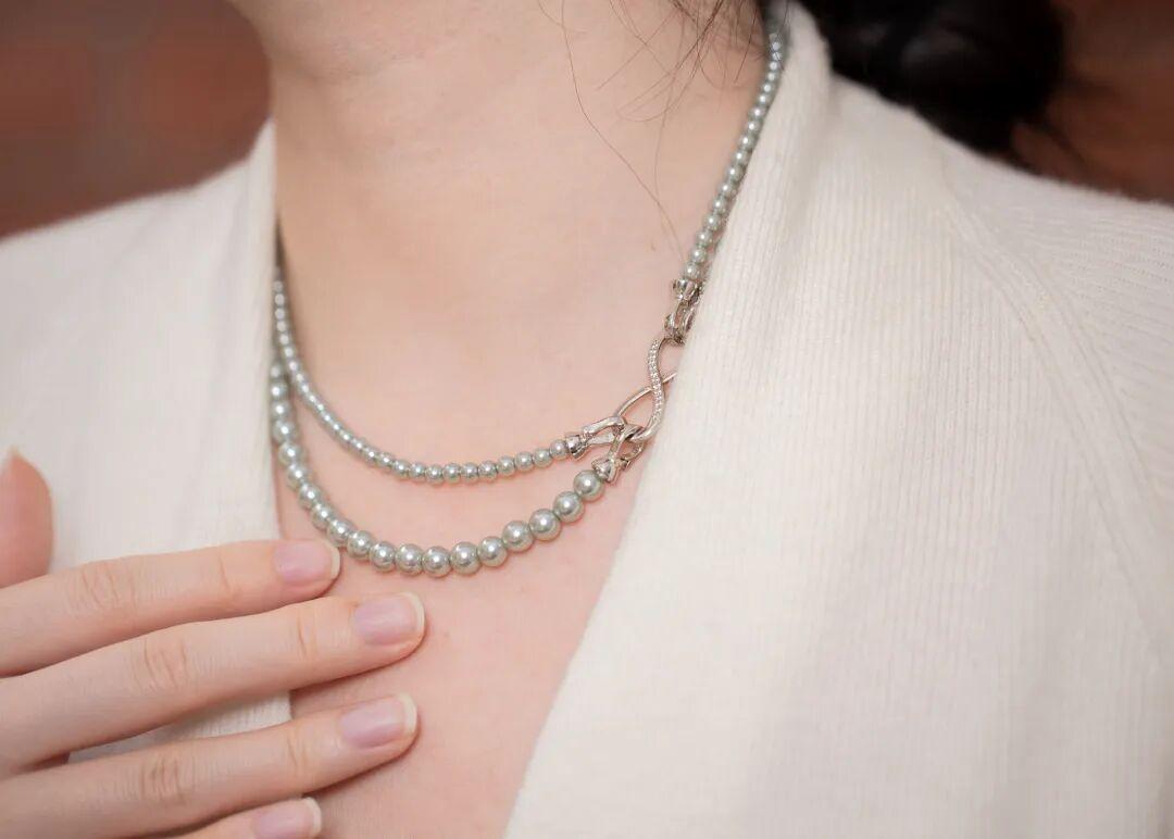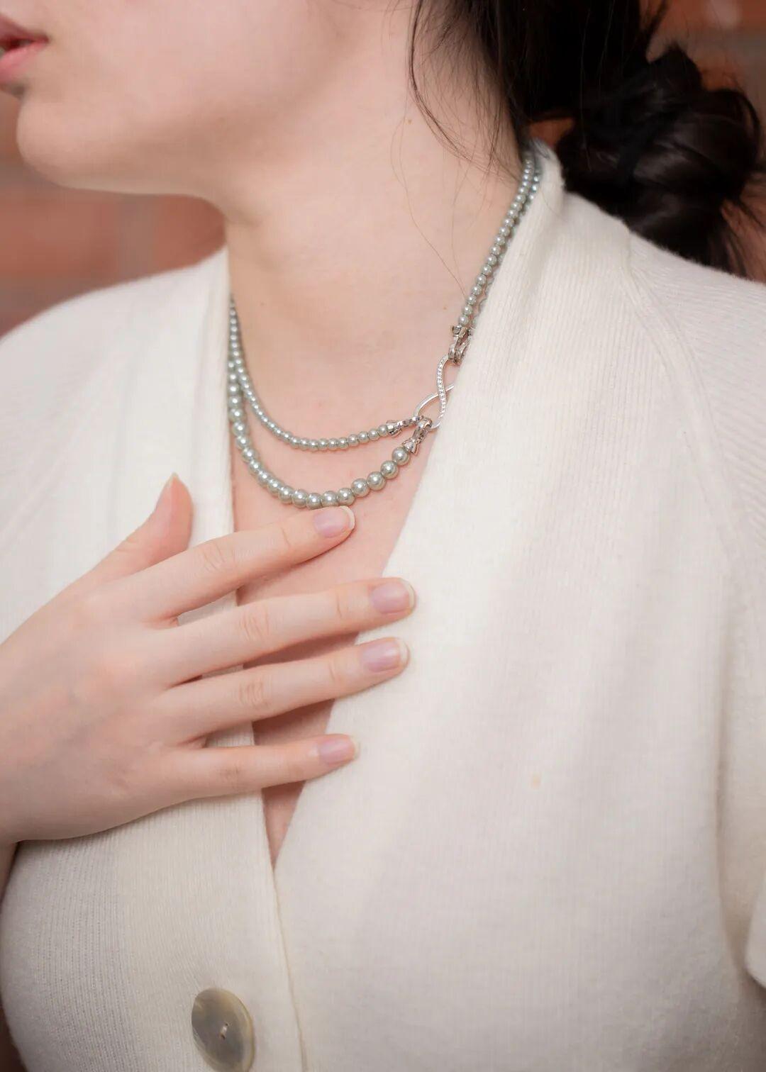 雙珠鏈是 一串3mm的人造真多麻和一串6mm的人造真多麻組合。顆顆光澤強勁,彷彿可以點亮海面,上身光彩照人。