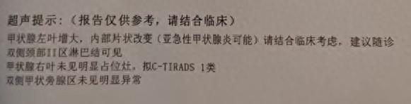 又是漫長的排隊,檢查結果顯示甲狀腺左葉增大,內部片狀改變(亞急性甲狀腺炎可能)。