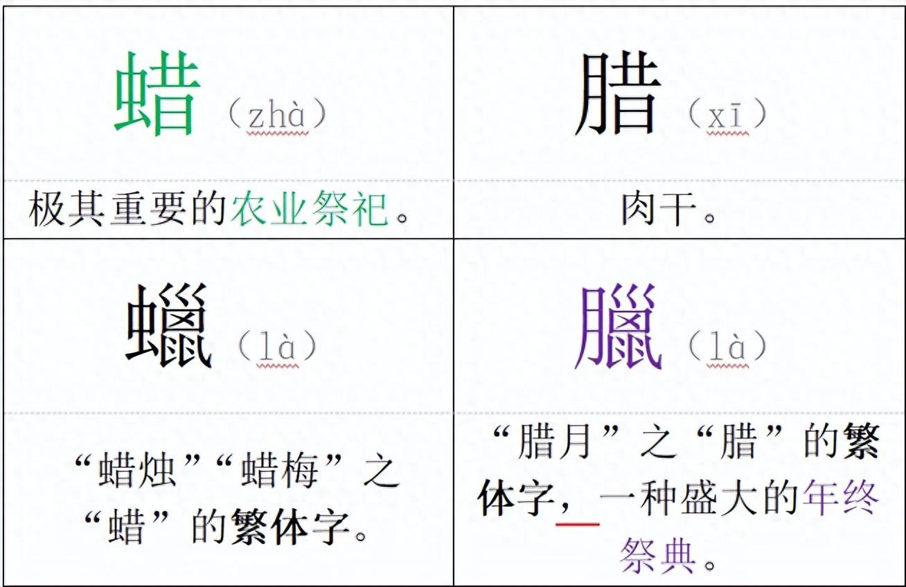 先秦時期有兩個冬季狂歡祭典,分別叫“蠟(zhà)祭”和“臘(là)祭”。“蜡祭”之“蠟”與“臘祭”之“臘”在簡化字中很容易混,但在繁體字系統裏,“蠟”仍寫作“蠟”,而“臘”則要寫成“臘”,倆字看長相就沒啥血緣關係。
