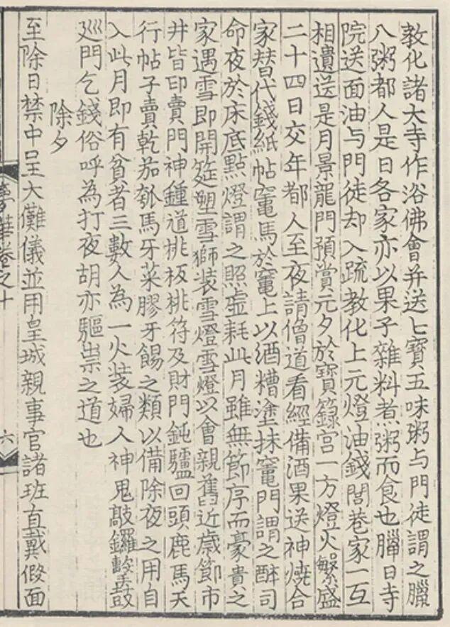 所以,在漢傳佛教中,十二月初八是一個非常值得紀念的日子。紀念的方式呢,一開始主要是擦洗佛造像(稱爲“浴佛”,漢傳佛教中另一個主要的浴佛日是四月初八“佛誕日”,它也是一個“八日”),以及信衆自己洗澡(以圖洗掉罪孽,它正好與臘除中的祛邪風俗相似);發展到宋代,則出現了盛大的齋會。孟元老《東京夢華錄》記載北宋的十二月初八日:“諸大寺作浴佛會,並送七寶五味粥與門徒,謂之‘臘八粥’。都人是日各家亦以果子、雜料煮粥而食也。”