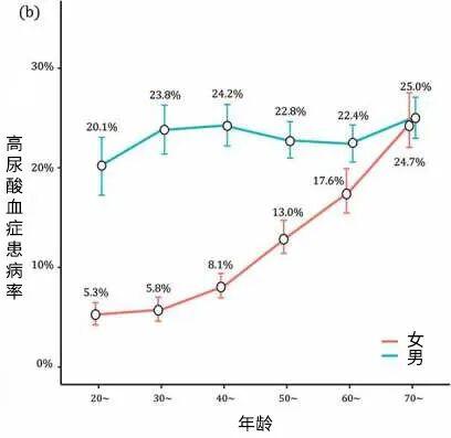 雌激素被認爲是造成性別差異的主要原因。雌激素能影響腎臟的清除和重吸收等功能,其高低與尿酸水平呈現負相關。由於第二性徵的發育、激素的不同,尿酸水平在青春期開始出現性別差異。這也是爲何,成年男性尿酸普遍高於同齡女性,但絕經後女性人羣與男性的差距逐漸縮小。