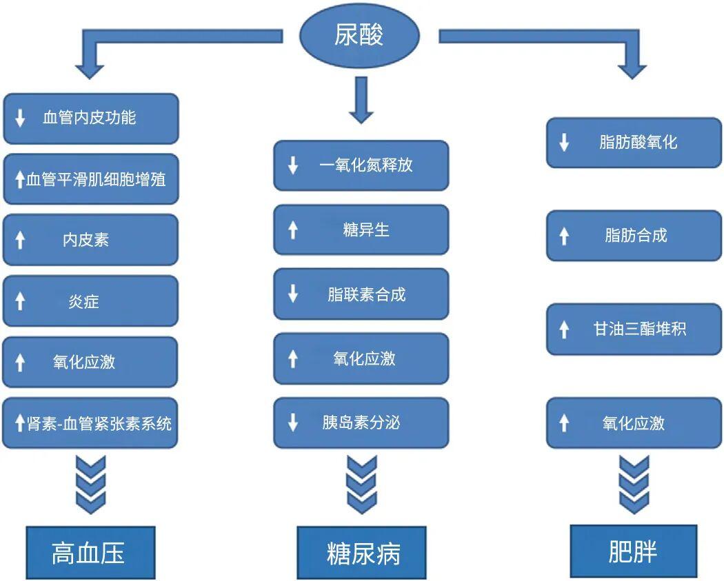 飲食中的糖攝入量與一系列代謝性疾病有關,比如異位脂肪堆積、肥胖、心血管疾病等,研究者們認爲這很大程度上可歸因於過量攝入果糖,並且尿酸合成過多可能是重要的中間機制之一。這也讓尿酸和更多慢性疾病的關聯開始浮現。