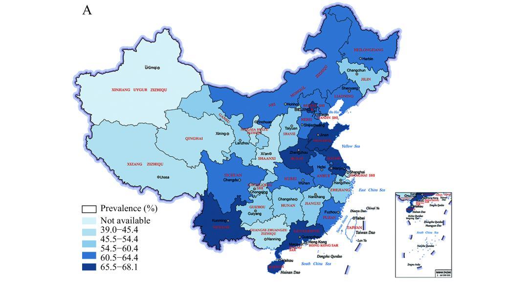 中國疾病預防控制中心發佈過一項研究,通過對31個省級行政區189198名成年人進行的代表性調查,發現中國南部地區的飲酒率也是最高的,在過去12個月內,男性飲酒流行率爲69.1%,女性爲28.4%。
