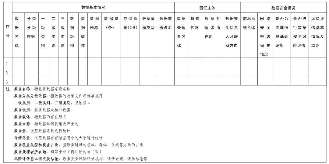 按照要求的頻度和格式向主管部門報送重要數據目錄,目錄格式詳見附錄B。
