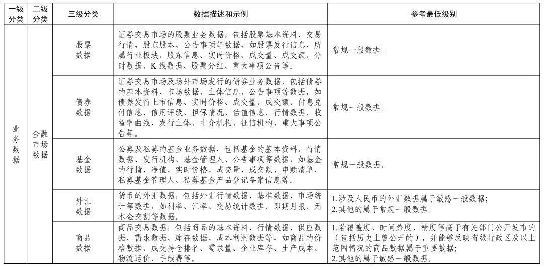 根據金融信息服務數據在經濟社會發展中的重要程度和敏感程度,以及一旦遭到泄露、篡改、損毀或者非法獲取、非法使用、非法共享,對國家安全、經濟運行、社會秩序、公共利益、組織權益、個人權益造成的危害程度,將數據從高到低分爲四級,分別爲核心數據、重要數據、敏感一般數據、常規一般數據。
