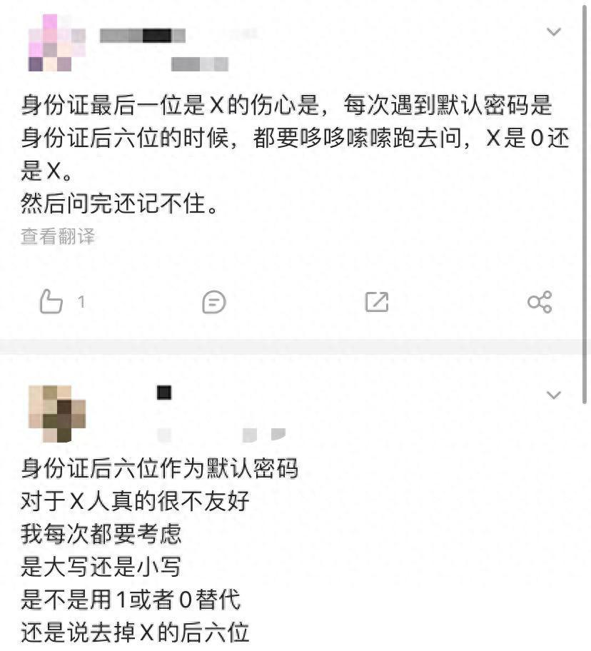 到網上隨便搜一搜,就能發現有很多“X之人”對默認密碼的抱怨。對於身份證尾號是數字的大部分朋友來說,“後六位”作爲各種賬號、證件的初始密碼是一件習以爲常的事。但對於身份證尾號是X的“天選之子”就沒那麼簡單了。